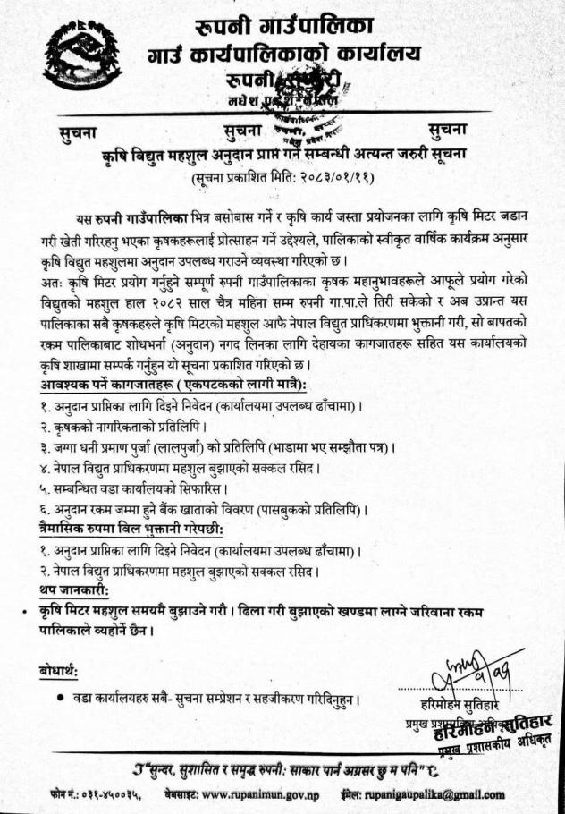 कृषि विधुत महशुल अनुदान प्राप्त गर्न सम्बन्धीअत्यन्त जरुरी सूचना |