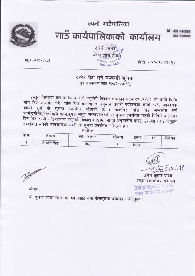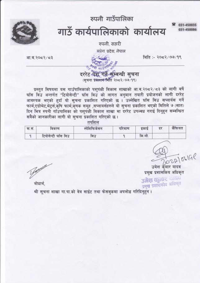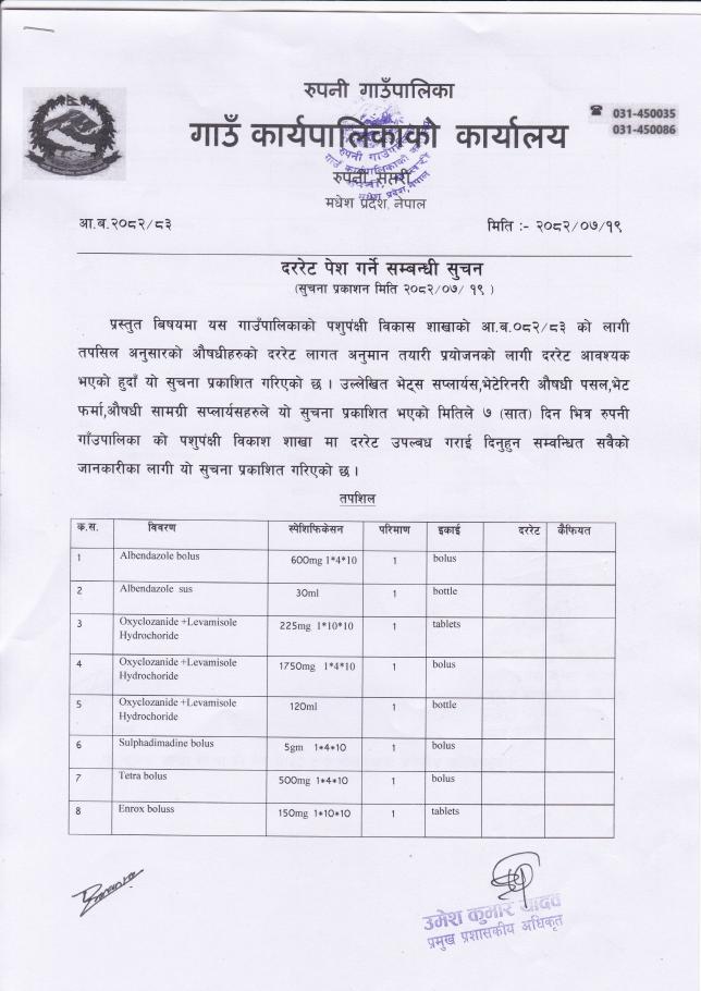पशुपंक्षी विकास शाखाको आ.ब.२०८२/०८३मा विभिन्न प्रयोजनका लागि प्रयोग हुने सामानहरुको दररेट पेश गर्ने सम्बन्धि सूचना |