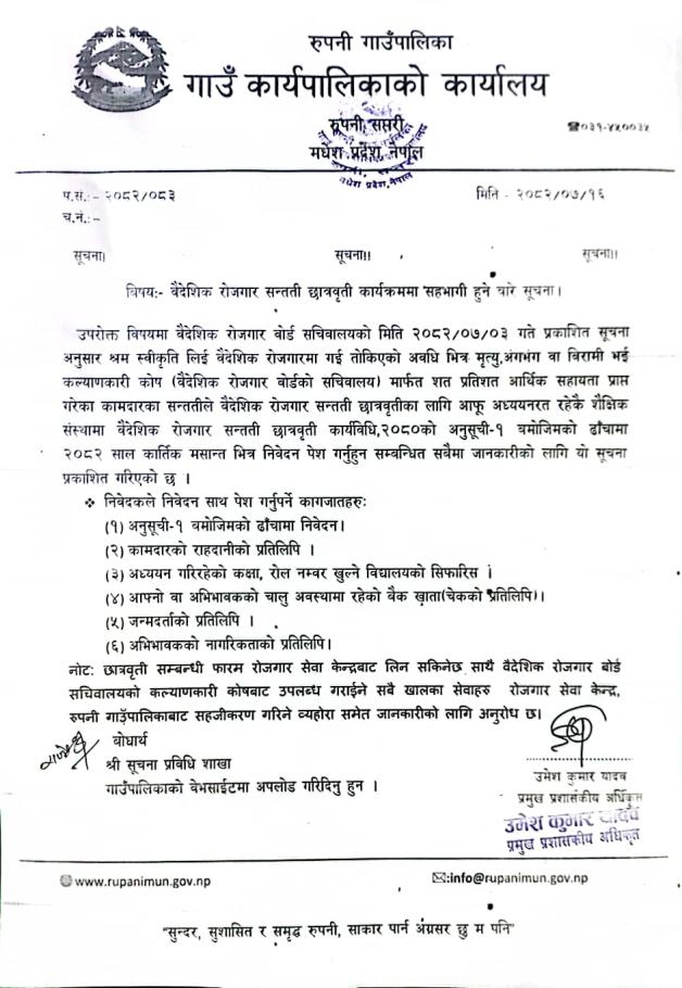 वैदेशिक रोजगार सन्तती छात्रवृति कार्यक्रममा सहभागी हुने बारे सूचना |