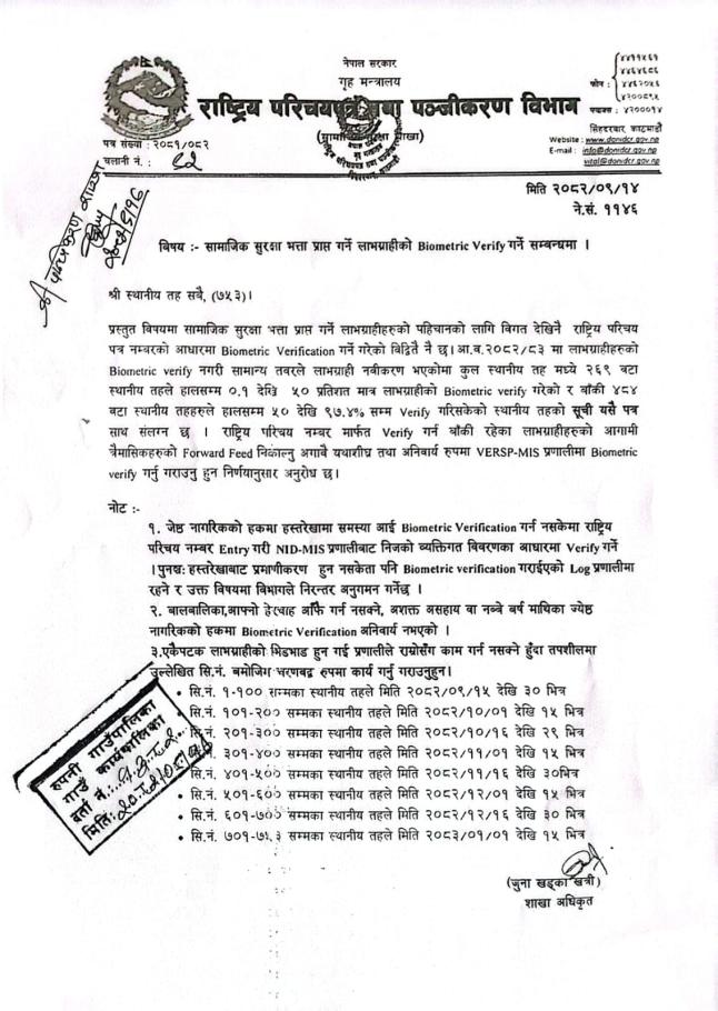 सामाजिक सुरक्षा भत्ता प्राप्त गर्ने लाभग्राहीको Biometric Verify गर्ने सम्बन्धमा |