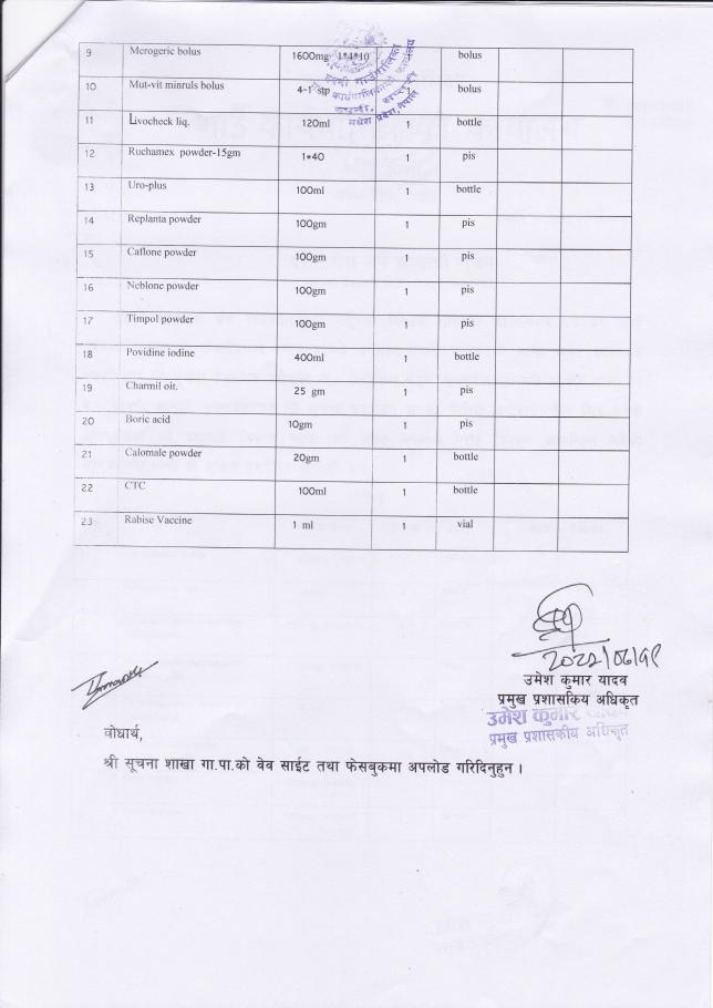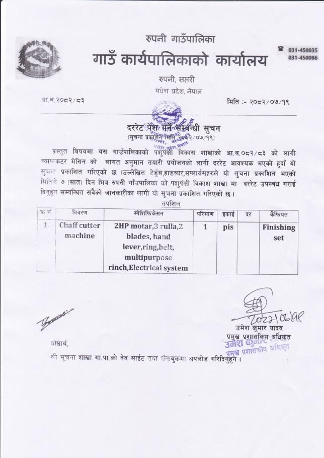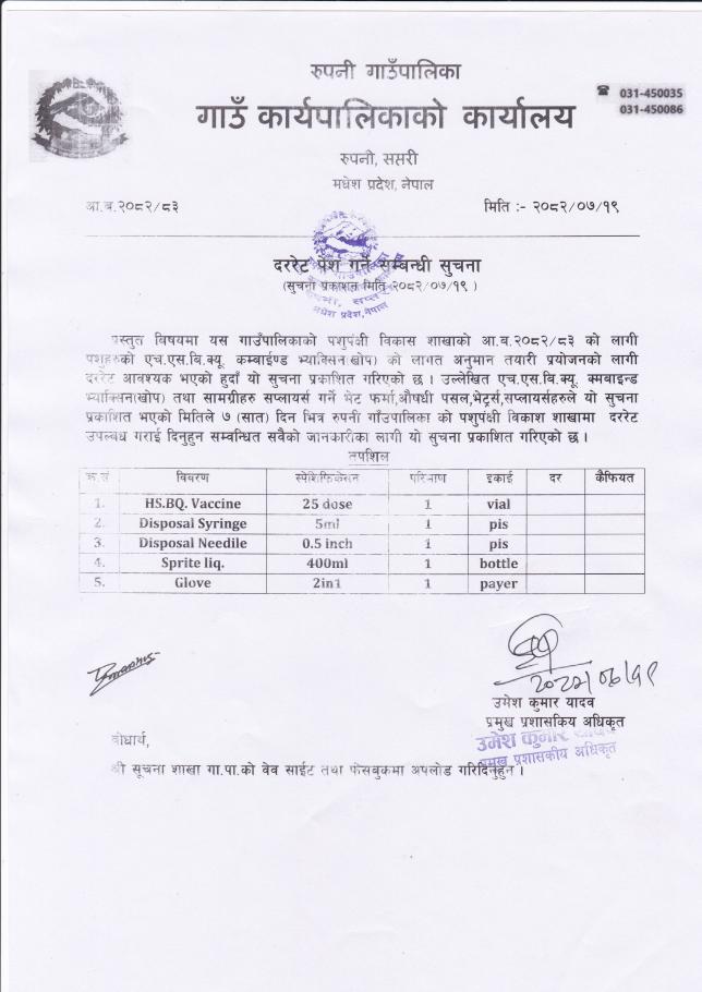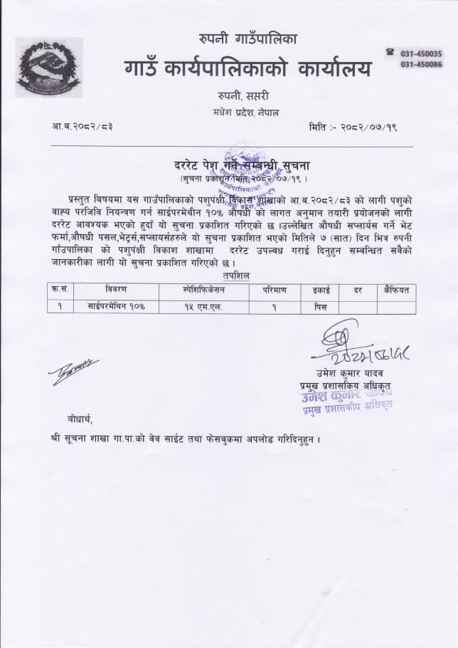 पशुपंक्षी विकास शाखाको आ.ब.२०८२/०८३मा विभिन्न प्रयोजनका लागि प्रयोग हुने सामानहरुको दररेट पेश गर्ने सम्बन्धि सूचना |