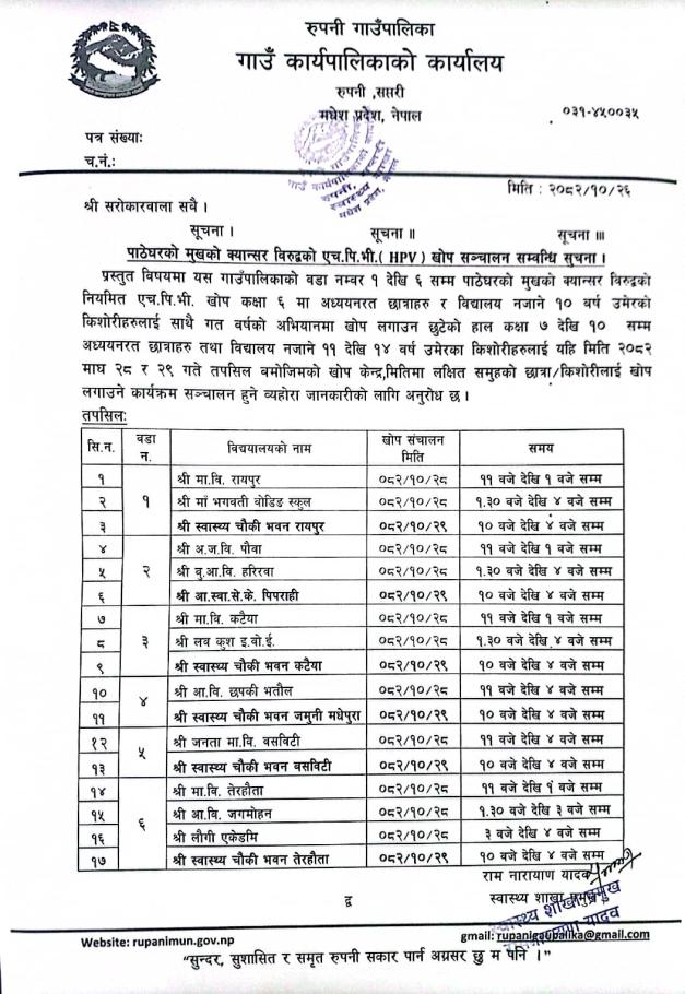 पाठेघरको मुखको क्यान्सर विरुद्धको एच.पि.भी.(HPV) खोप संचालन सम्बन्धी सूचना |