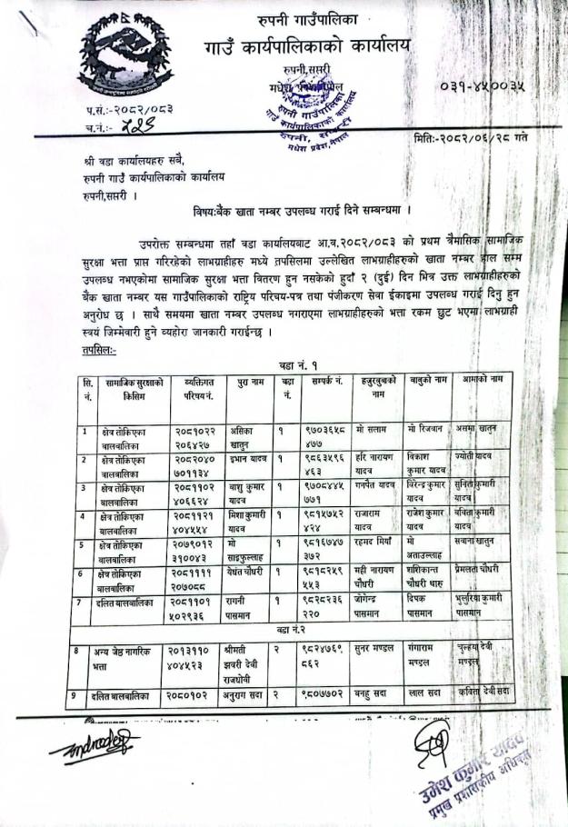 सामाजिक सुरक्षा भत्ता प्राप्त गर्ने लाभग्राहीहरुको नाम नविकरण गराउने सम्बन्धि अत्यन्त जरुरि सूचना |