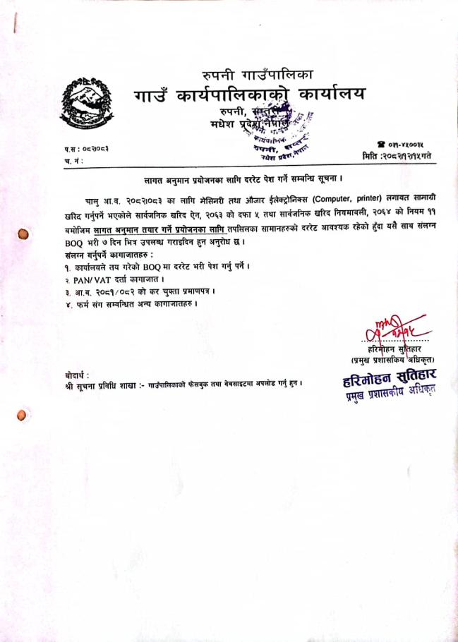 लागत अनुमान प्रयोजनका लागि दररेट पेश गर्ने सम्बन्धि सूचना |