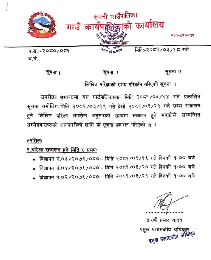 लिखित परीक्षाको समय परिवर्तन गरिएको बारे सुचना।