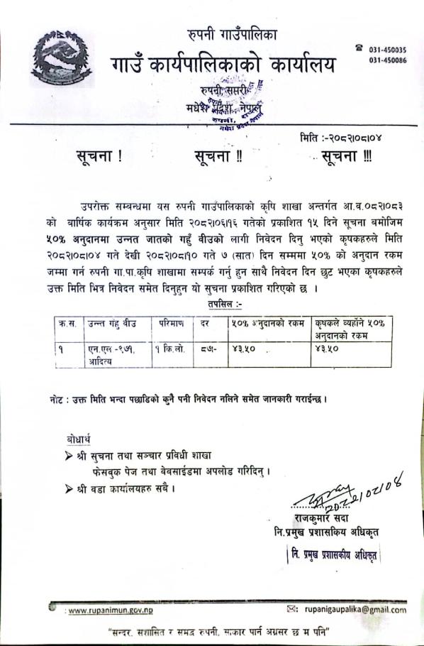 आ.व .२०८२/०८३ बार्षिक कार्यक्रम अनुसार ५०%अनुदानमा उन्नत जातको गंहु विउ वितरण सम्बन्धमा